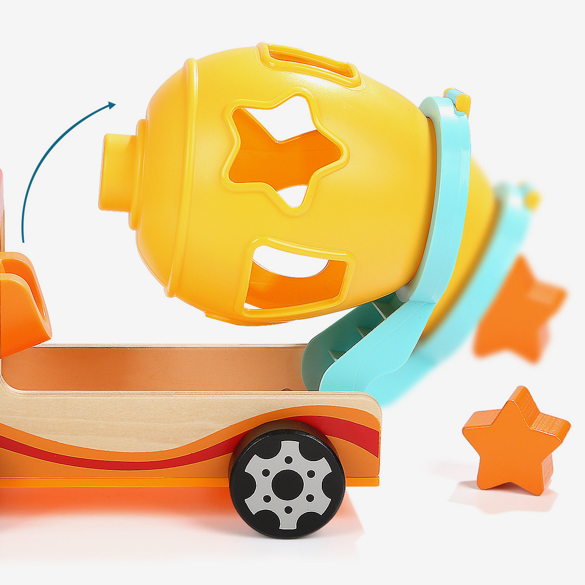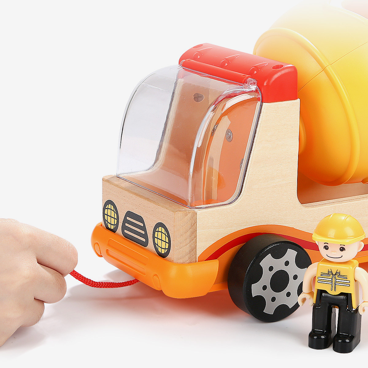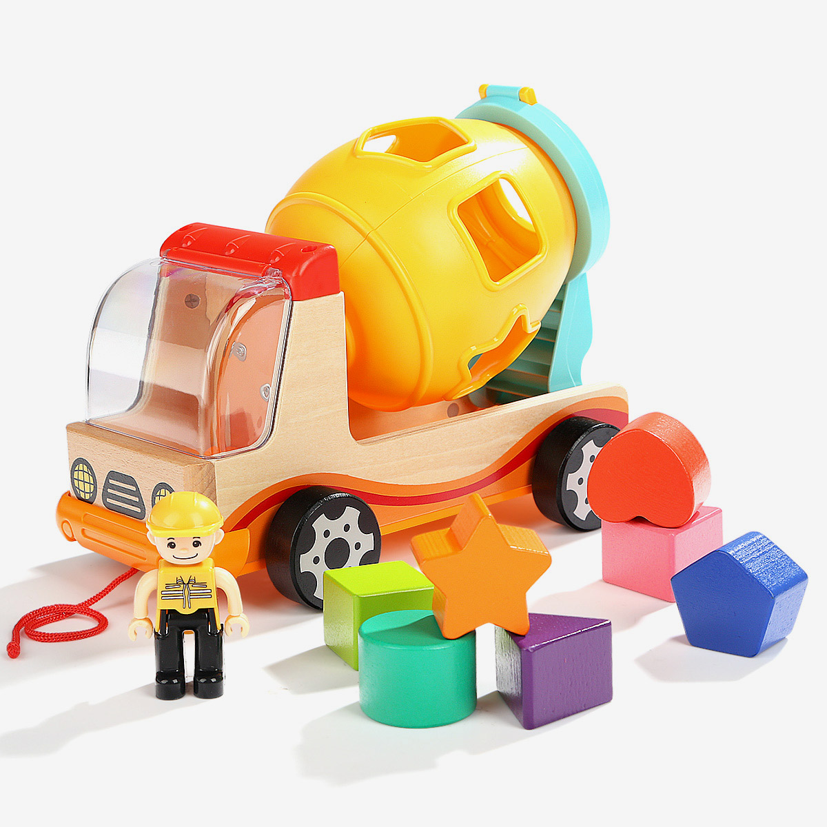 Napravljena od kvalitetnog drveta i sigurne BPA free postojane plastike, sa bojama na vodenoj bazi, odličan je poklon ako tražite kvalitetnu i dugotrajnu igračku. Sastoji se od kamiona, 7 drvenih elemenata za ubacivanje u otvore mešalice, 1 drvena figurica vozača.