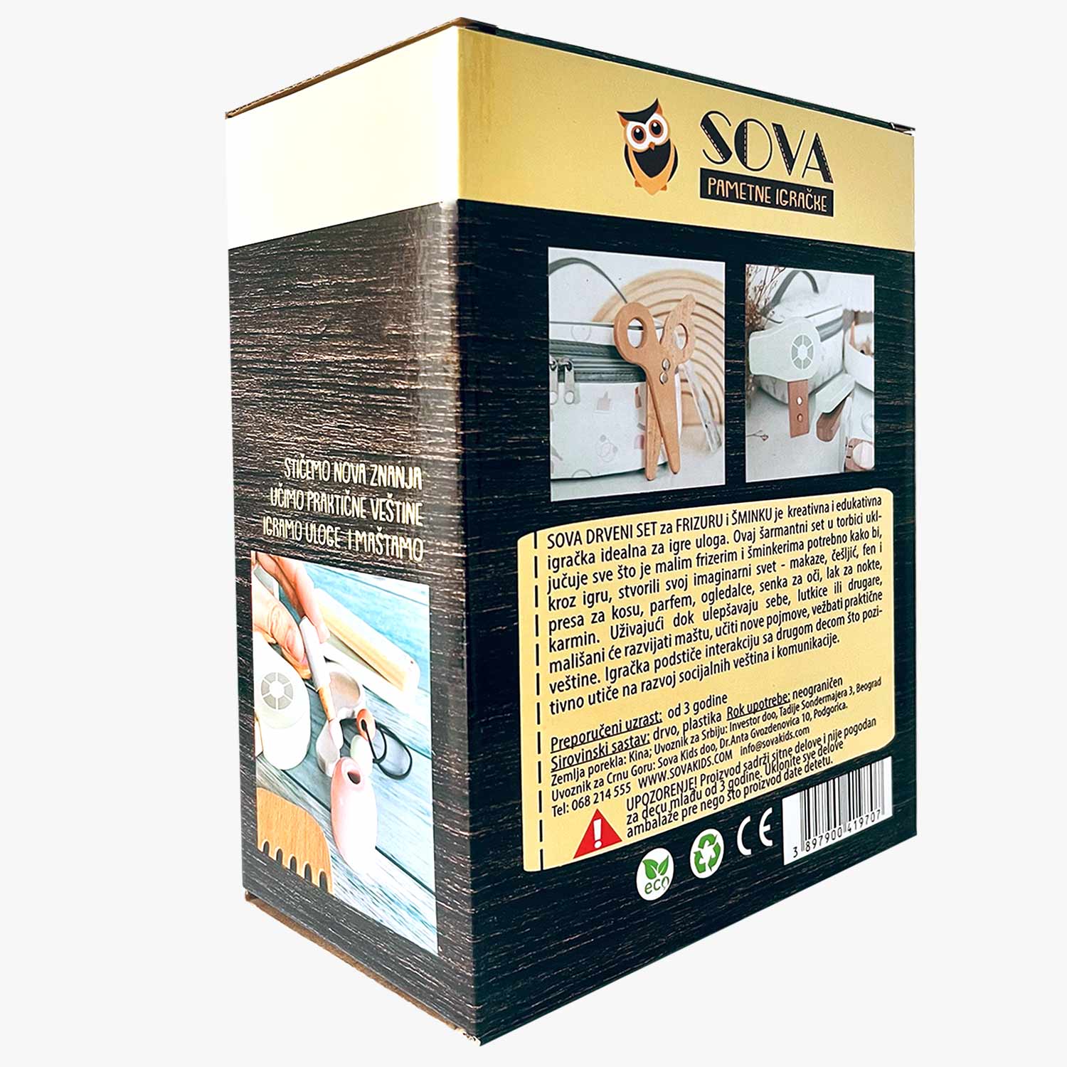 SOVA DRVENI SET za FRIZERU i ŠMINKU je kreativna i edukativna igračka idealna za igre uloga. Ovaj šarmantni set u torbici uključuje sve što je malim frizerim i šminkerima potrebno kako bi, kroz igru, stvorili svoj imaginarni svet - makaze, češljić, fen i presa za kosu, parfem, ogledalce, senka za oči, lak za nokte, karmin.