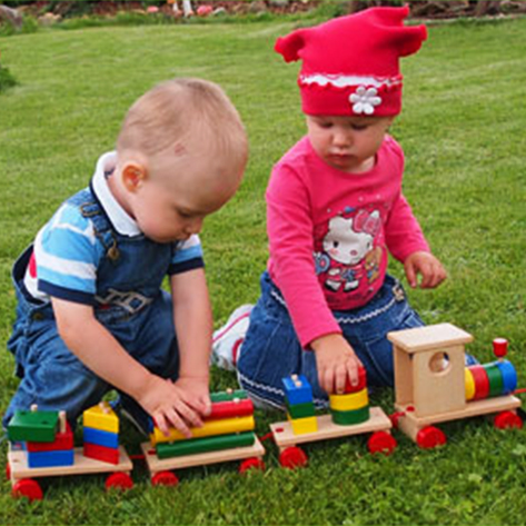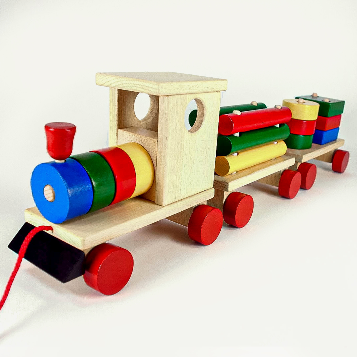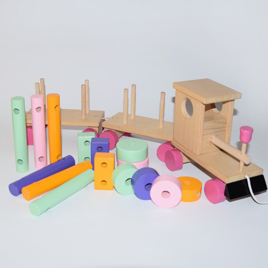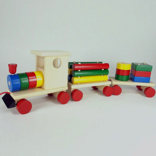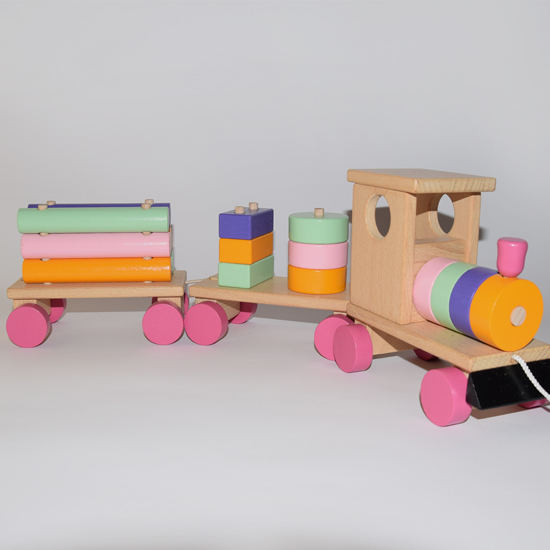 Sastoji se od lokomotive i dva vagona na kojima su drvene figure različitih oblika i boja. Vagoni i sve figure se mogu rastavljati i odvajati od lokomotive što podstiče razvoj motoričkih veština kod deteta.