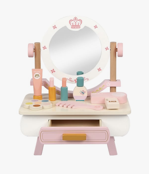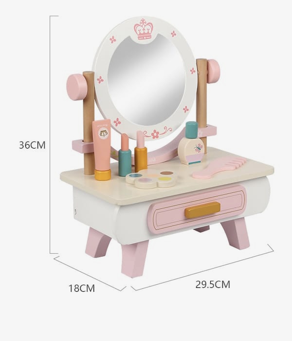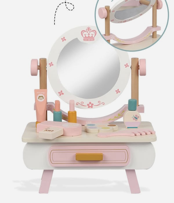 Drveni sto sa ogledalom i raznovrsnom paletom šminke koja će zadovoljiti svaku malu modnu umjetnicu.