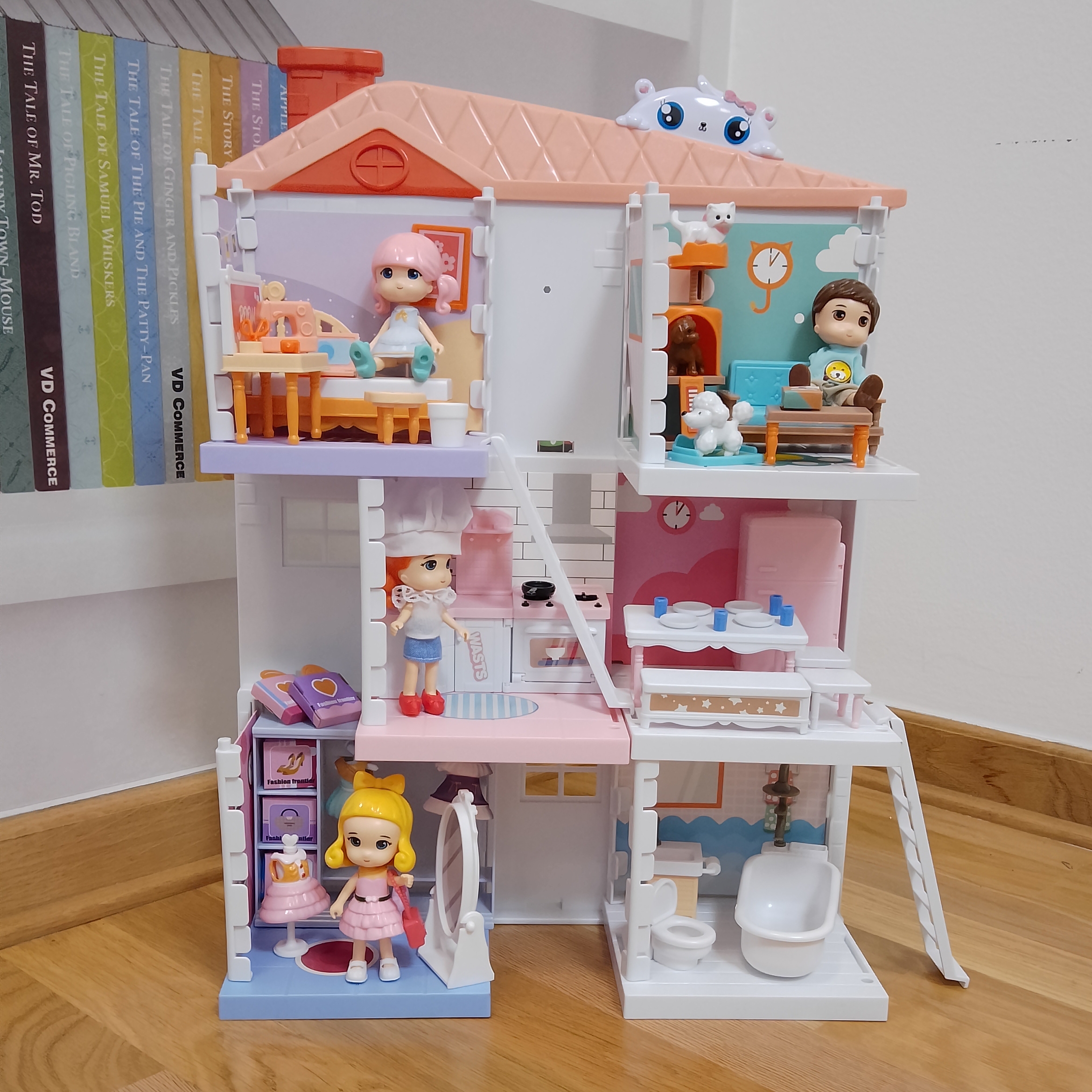Ova posebna i kreativna igračka pruža mogućnosti za beskrajnu zabavu i igru u šarenom svetu veselih lutkica. Sastaviti kućicu sa svim divno dizajniranim sobama, prostorijama i nameštajem, biće najlepši, ali ne tako lak zadatak jer se sastoji od puno malih dijelova i detalja. Naoružajte se strpljenjem! A posle kreće uživanje u igri sa njenim malim stanarima - 4 lutkice i njihove male kuce.