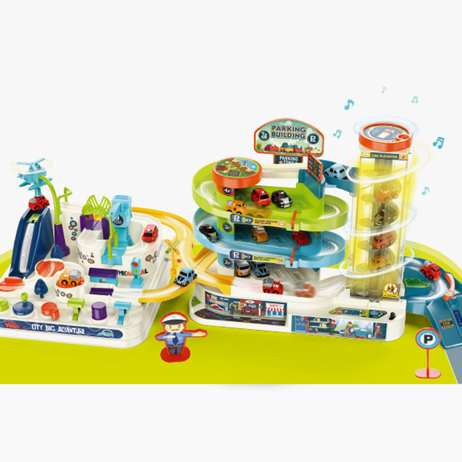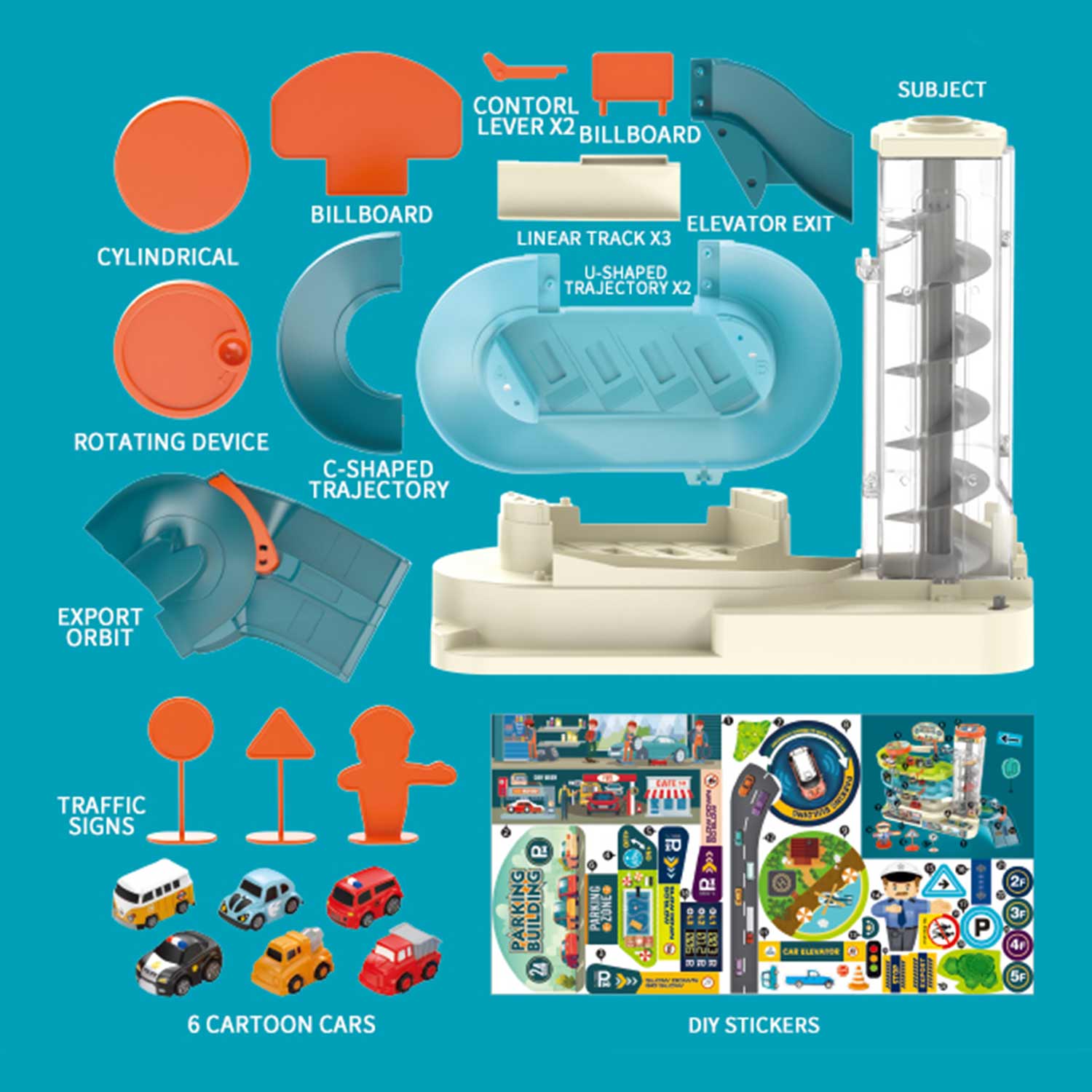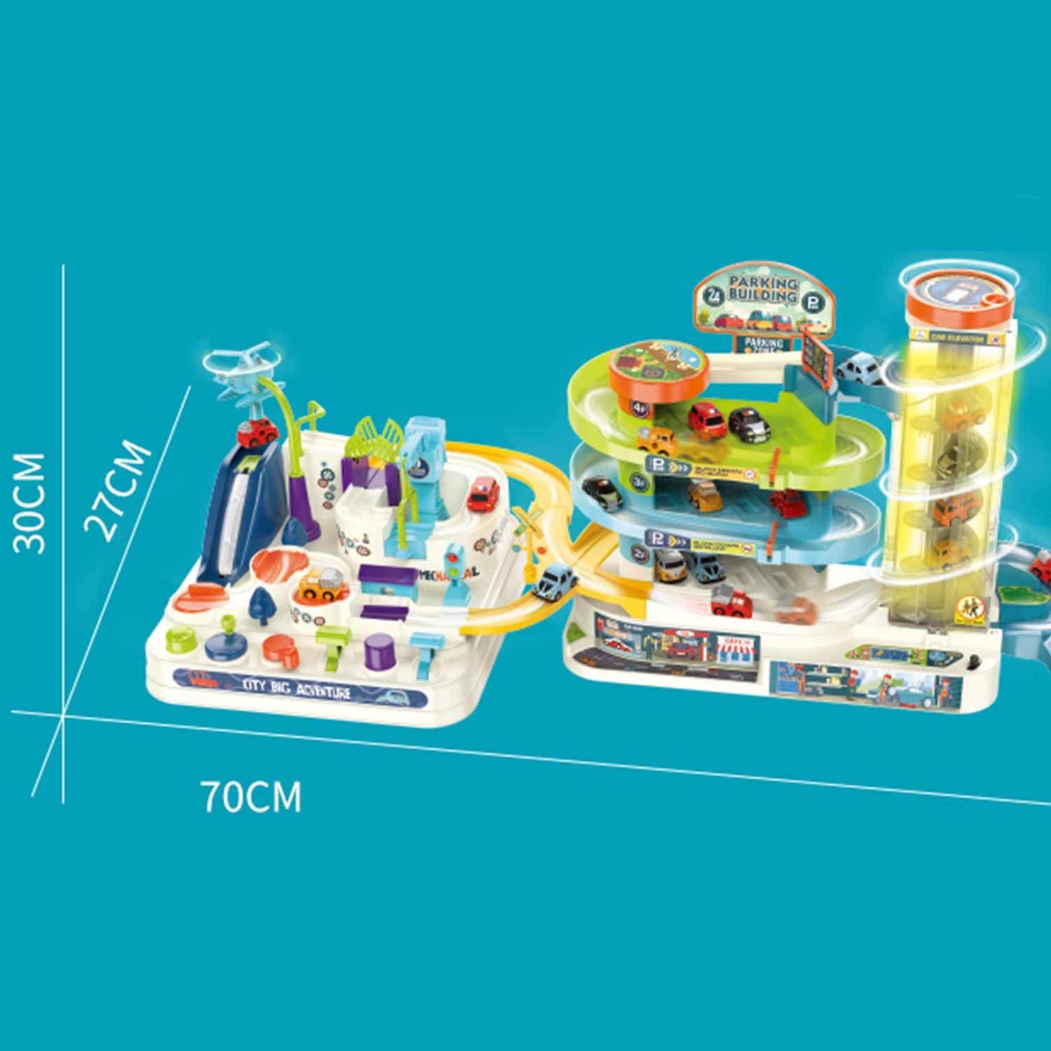 Komplet se sastoji od dva fantastična dela, podjednako interesantna i međusobno povezana auto stazama. U auto parku, mališane čeka neverovatna zabava dok sami upravljaju brojnim elementima - dizalica za auto, pokretne trake, platforme za rotaciju, heliodrom sa helihopterom i magnetom za prenošenje autića, most koji se podiže i spušta... Drugi deo čini velika, moćna garaža na 3 sprata sa rotirajućim liftom koji se može pokretati manuelno i elektronski. Sa vrha garaže autići će se brzo spuštati pomoću tobogana. Uz garažu dolazi 6 autića (putnički, policija, bager, vatrogasci, autobus, kamion) što će igru učiniti još sadržajnijom.