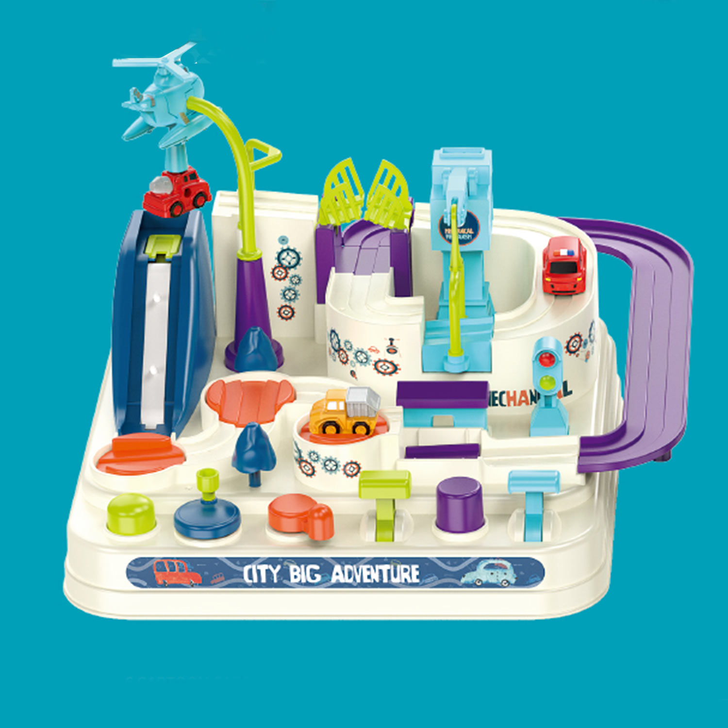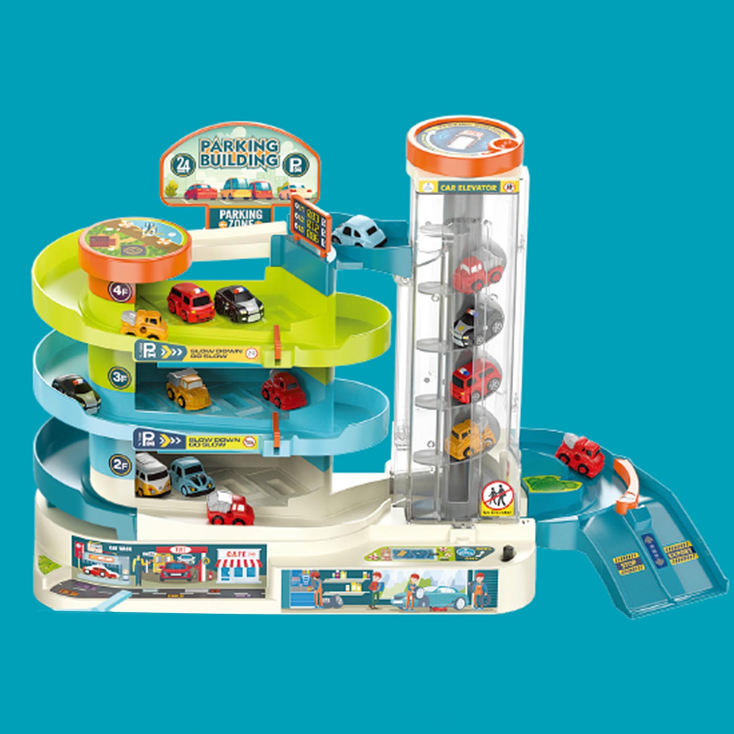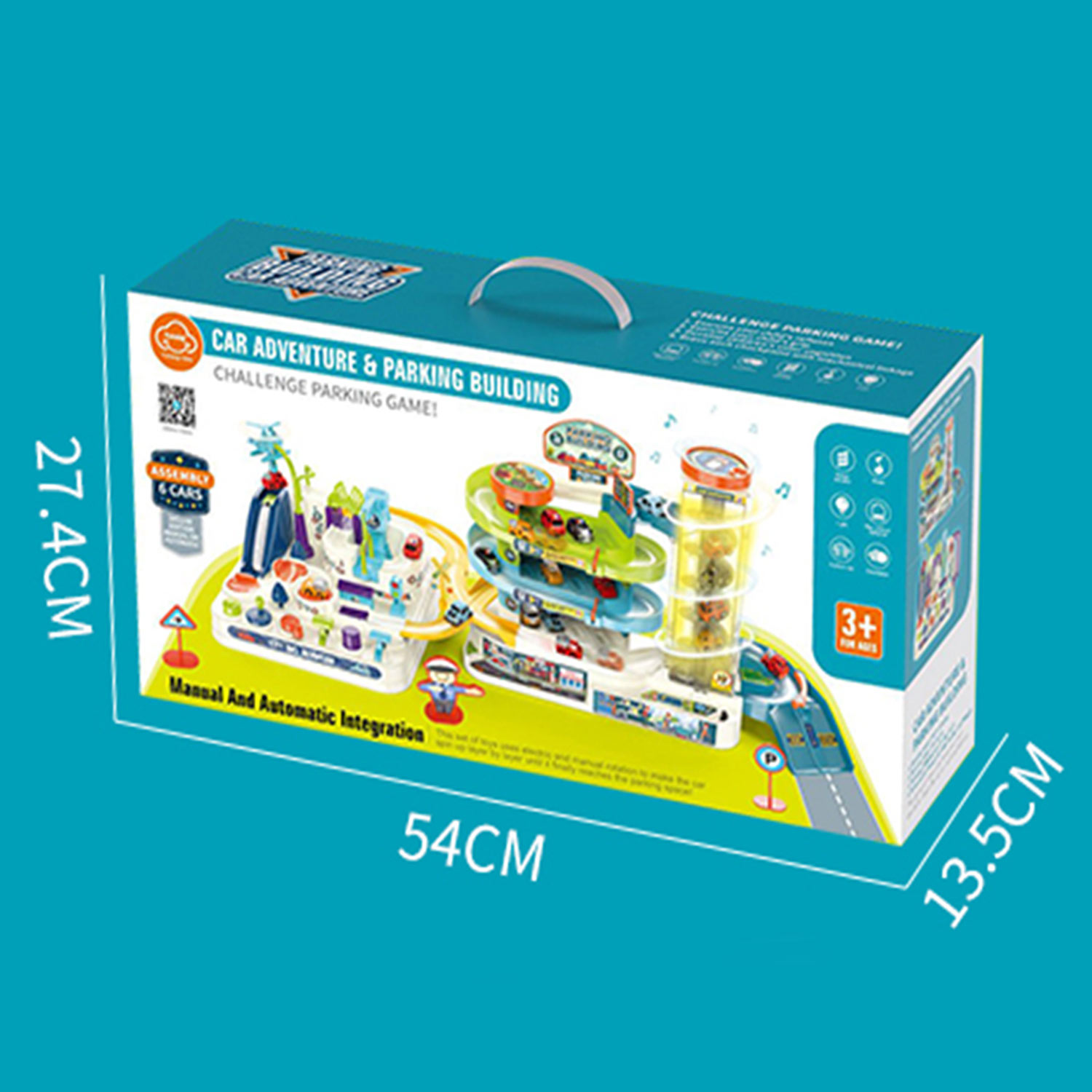 Komplet se sastoji od dva fantastična dela, podjednako interesantna i međusobno povezana auto stazama. U auto parku, mališane čeka neverovatna zabava dok sami upravljaju brojnim elementima - dizalica za auto, pokretne trake, platforme za rotaciju, heliodrom sa helihopterom i magnetom za prenošenje autića, most koji se podiže i spušta... Drugi deo čini velika, moćna garaža na 3 sprata sa rotirajućim liftom koji se može pokretati manuelno i elektronski. Sa vrha garaže autići će se brzo spuštati pomoću tobogana. Uz garažu dolazi 6 autića (putnički, policija, bager, vatrogasci, autobus, kamion) što će igru učiniti još sadržajnijom.