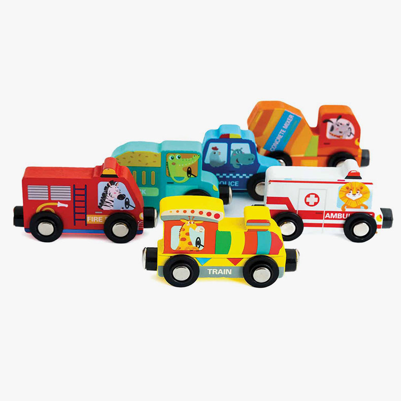 Sva važna vozila su tu - policija, hitna pomoć, vatrogasci, kamion, autobus, kao i mali semafor i saobraćajni znaci, što svaki put obećava drugačiju i zanimljivu igru. Autići imaju magnete pa mogu brzo postati i vozić.