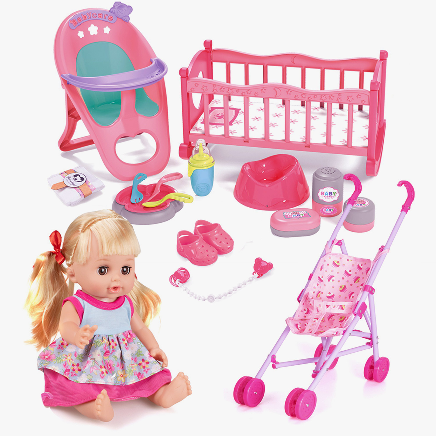 Lutka je napravljena od kvalitetnog mekog materijala, može da pije vodu, a devojčicama će biti zanimljivo da joj, kao kod prave bebe, menjaju pelenu koja od vode postane mokra. Posebno će ih oduševiti i 12 različitih slatkih zvukova koji se, na pritisak stomaka, mogu čuti jer zvuče baš kao prava beba dok se smeje, plače, govori... Pored lutke komplet sadrži: kolica na rasklapanje, kolevku, hranilicu, pelene, pribor za jelo, tutu, sapun, pelene, puder, cuclu, flasicu za vodu, papuče